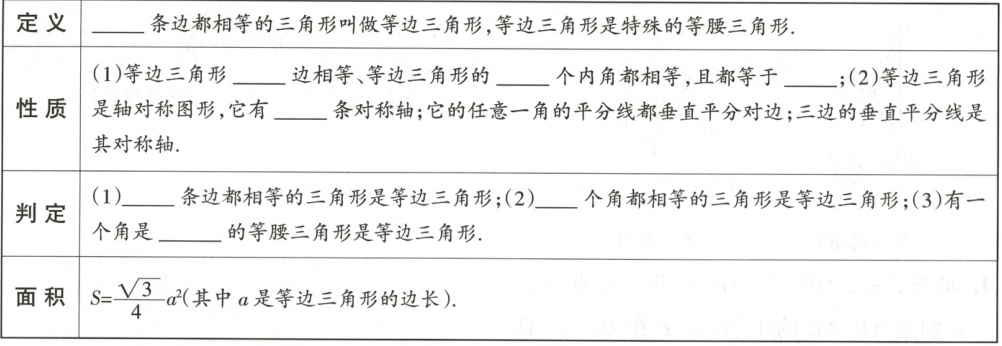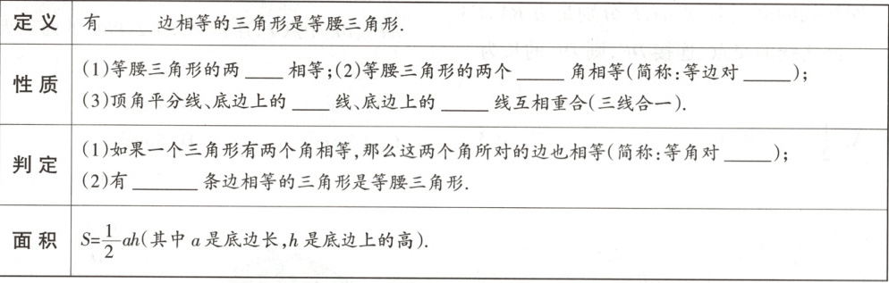定义:两条;性质:腰,底,等角,中,高;判定:等边,两。