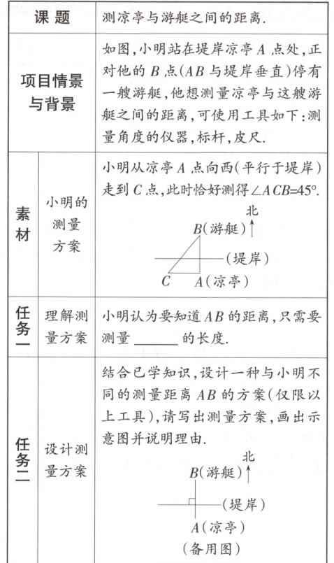 任务二:设计方案:如图,找到堤岸上与AB的交点E(测$\angle AED = 90^{\circ}$),从点E出发,沿堤岸向西走到点D,此时恰好测得$\angle EDB = 45^{\circ}$,要知道AB的距离,只需要测量出ED与AE的长度即可。理由: