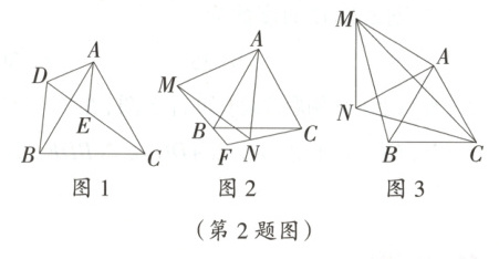 $^{\circ}$;【深入探究】换成两个全等的等边三角形继续研究.如图 2,$\triangle ABC$和$\triangle AMN$都是等边三角形,且$\triangle ABC\cong\triangle AMN$,$AB = 6$.