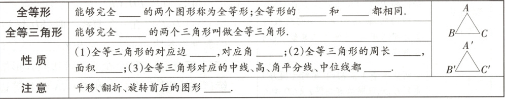 考点一 全等三角形的有关概念及性质(必考,考查全等三角形的对应边、对应角相等)