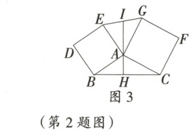 问题拓展:(3)如图 3,过 $\triangle ABC$ 的边 $AB$,$AC$ 向外作正方形 $ABDE$ 和正方形 $ACFG$,$AH$ 是 $BC$ 边上的高,延长 $HA$ 交 $EG$ 于点 $I$,证明:$I$ 是线段 $EG$ 的中点。