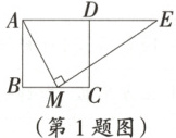 1. 如图,在正方形 $ABCD$ 中,$M$ 为 $BC$ 上一点,$ME \perp AM$,$ME$ 交 $AD$ 的延长线于点 $E$。若 $AB = 12$,$BM = 5$,则 $DE$ 的长为(
