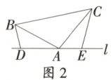 问题发现:(1)如图 1,在 $\triangle ABC$ 中,已知 $\angle BAC = 90^{\circ}$,$AB = AC$,直线 $l$ 经过点 $A$,$BD \perp l$,$CE \perp l$,垂足分别为点 $D$,$E$。证明:$\triangle ADB \cong \triangle CEA$;
