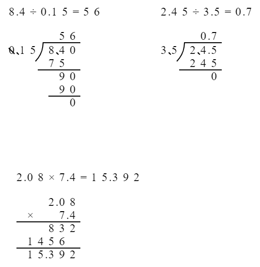 $8.4÷0.15 =$ $2.45÷3.5 =$