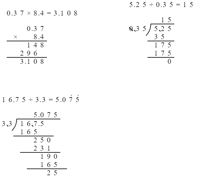 $0.37×8.4=$ $5.25÷0.35=$ $16.75÷3.3≈$