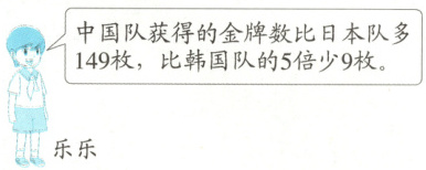 中国队获得的金牌数比日本队多149枚,比韩国队的5倍少9枚。