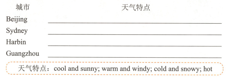 任务(二):将下列城市与对应的天气特点匹配,把天气填在横线处。