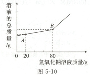 4. (2025淮安涟水一模)取80 g CuSO₄溶液放入烧杯中,向烧杯中逐滴加入20%的NaOH溶液,烧杯中溶液的总质量与所滴入NaOH溶液质量的关系曲线如图5-10所示。试回答: