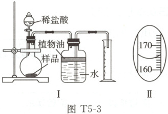 取 3 g 部分变质的氢氧化钠样品与足量的稀盐酸反应,测量生成气体的体积(气体不溶于植物油),从而计算出样品中 $m$ 的质量,便可求出样品中 $m$ 的质量分数。实验装置(气密性良好) 如图 T5-3Ⅰ所示。