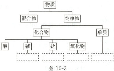 1.【人教九下P87结构图改编】分类是学习和研究物质的方法,按照物质的组成对氯化铁、氢气、氢氧化钡、五氧化二磷四种物质进行分类,请将分类结果填写在图10-3相应的虚线框内(用化学式表示)。