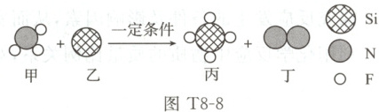 。(4)用 NF₃ 气体蚀刻硅芯片时会生成四氟化硅气体,如图 T8-8 为该反应的微观示意图。