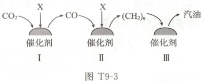 我国科学家研制出一种新型催化剂,可将$CO$转化为汽油,主要转化过程如图 T9-3 所示。X 是一种单质,I 中生成的另一种物质是常见的溶剂。下列说法错误的是(