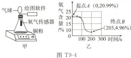 图 T9-4 甲),同时借助传感器测定锥形瓶内空气中氧气含量的变化(如图乙)。下列说法