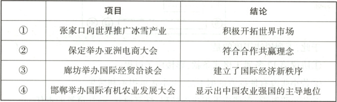 【解题思路】张家口向世界推广冰雪产业,能够提升其国际影响力,增强市场竞争力,进而开拓世界市场,①正确。保定举办亚洲电商大会,为海内外电子商务企业提供了合作交流平台,符合合作共赢理念,②正确。国际经济新秩序还未建立,③错误。中国目前还不是农业强国,“中国农业强国的主导地位”说法错误,④排除。