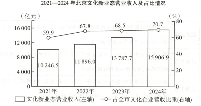 (1)问,要求读图,分析北京文化产业的发展变化。根据材料中2021—2024年北京文化新业态营业收入情况,可从文化新业态营业收入持续增长的角度,说明文化新业态发展迅速。根据材料中2021—2024年北京文化新业态营业收入占全市文化企业营收的比重,可从文化新业态营业收入占比不断提高的角度分析。根据材料“新业态特征明显的行业包括广播电视集成播控、互联网搜索服务、数字出版、互联网文化娱乐平台、版权和文化软件服务、可穿戴智能文化设备制造等”,可从北京文化产业结构在不断优化的角度分析。第