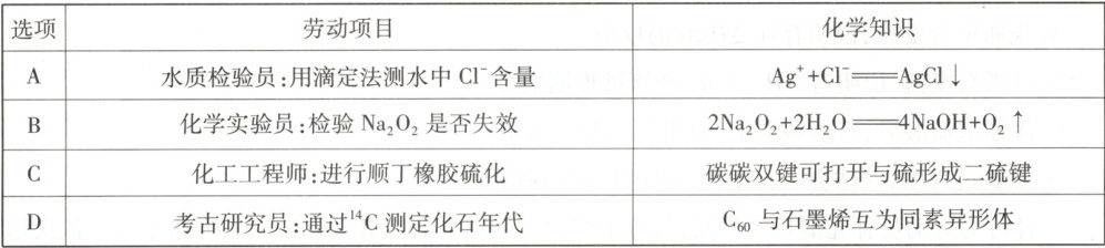 解题思路:可用AgNO₃标准溶液滴定水样,测定水样中Cl⁻含量,滴定时发生反应Ag⁺+Cl⁻=AgCl↓,A项不符合题意。Na₂O₂久置会转化为Na₂CO₃,Na₂CO₃与水不反应,Na₂O₂能与水发生反应2Na₂O₂+2H₂O=4NaOH+O₂↑,B项不符合题意。顺丁橡胶硫化是指顺丁橡胶与硫等硫化剂混合后加热,硫化剂将顺丁橡胶中的碳碳双键打开与硫形成二硫键(—S—S—),把线型结构连接为网状结构,得到既有弹性又有强度的顺丁橡胶,C项不符合题意。考古研究员通过¹⁴C测定化石年代是利用同位素的放射性,通过半衰期计算出化石的年代,与“C₆₀与石墨烯互为同素异形体”无关,D项符合题意。