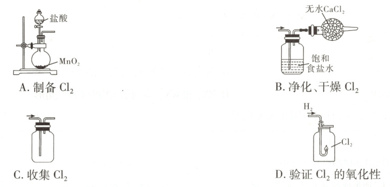 解题思路:MnO₂与浓盐酸需要在加热条件下制取氯气,图示装置缺少加热装置,分液漏斗中应盛放浓盐酸,A项错误。制备的Cl₂中混有HCl气体和水蒸气,通过盛有饱和食盐水的洗气瓶除去混有的HCl气体,通过盛有无水CaCl₂的球形干燥管除去水蒸气,B项正确。Cl₂的密度大于空气,可利用向上排空气法收集Cl₂,C项正确。H₂在Cl₂中可以燃烧,发生反应$H₂+Cl₂\overset{点燃}{=}2HCl,$可验证Cl₂的氧化性,D项正确。