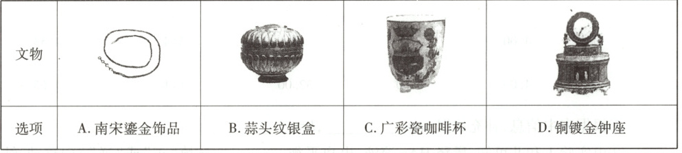 解题思路:鎏金制品、纹银盒、铜镀金钟座均属于金属制品,A、B、D项均不符合题意。广彩瓷咖啡杯属于瓷器,属于硅酸盐制品,C项符合题意。