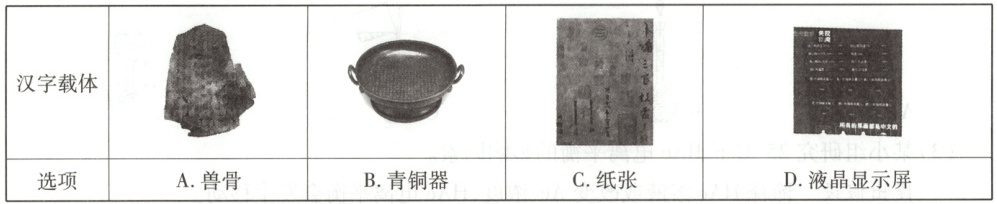 1. 中华文明源远流长,在世界文明中独树一帜,汉字居功至伟。随着时代发展,汉字被不断赋予新的文化内涵,其载体也发生相应变化。下列汉字载体主要由合金材料制成的是(