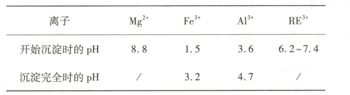 已知:月桂酸(C₁₁H₂₃COOH)熔点为44 ℃;月桂酸和(C₁₁H₂₃COO)₃RE均难溶于水。该工艺条件下,稀土离子保持+3价不变;$(C_{11}H_{23}COO)_{2} Mg$的$K_{ sp}=1.8×10^{-8}$;Al(OH)₃开始溶解时的pH为8.8;有关金属离子沉淀的相关pH见下表。