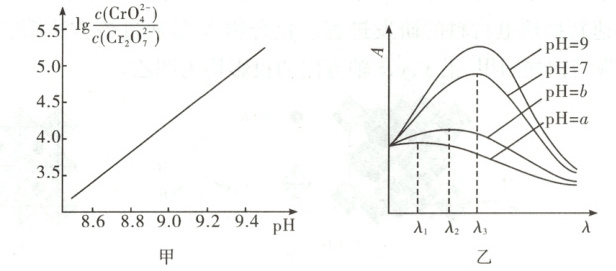 (写出计算过程,结果保留两位有效数字)。③在稀溶液中,一种物质对光的吸收程度(A)与其所吸收光的波长(λ)有关;在一定波长范围,最大A对应的波长(λₘₐₓ)取决于物质的结构特征;浓度越高,A越大。混合溶液在某一波长的A是各组分吸收程度之和。为研究pH对反应(ⅰ)和(ⅱ)平衡的影响,配制浓度相同、pH不同的K₂Cr₂O₇稀溶液,测得其A随λ的变化曲线如图乙。波长λ₁、λ₂和λ₃中,与CrO₄²⁻的λₘₐₓ最接近的是