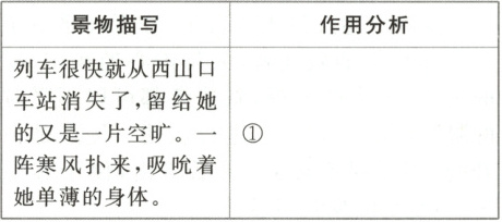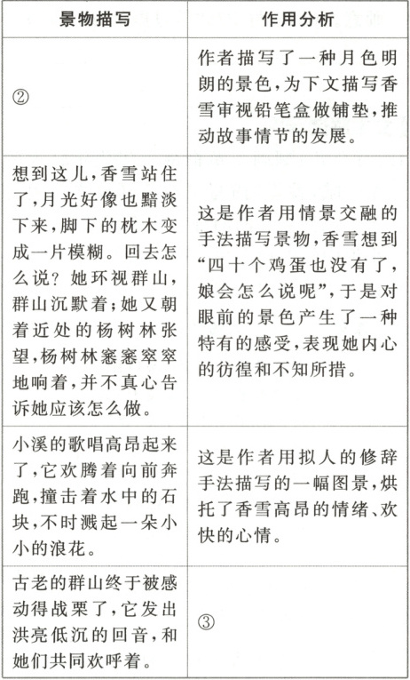 1. 小说没有激烈的冲突和曲折的故事,只是捕捉了几个小的生活场景,细致入微地描绘了香雪等几位姑娘的心理变化与情感波澜。香雪下车后的心理活动主要是通过环境描写与心理描写相结合塑造的,试着找出本文中富有特点的景物描写,并分析其作用。(见教材P28“学习提示”第2段)