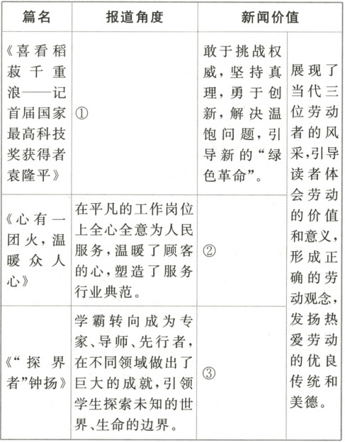 阅读通讯报道,要关注作者如何通过不同的渠道采集材料,又是怎样多角度、分层次进行报道的。这三篇人物通讯的主角虽然身份不同,劳动内容各异,但都是时代的楷模。请从报道角度和新闻价值的方面,分析各自的特点。填写下表。(见教材P50“学习提示”第4段)