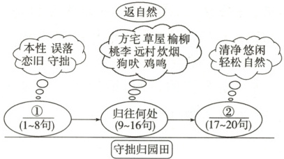 2.①先写近景,再写远景,远近结合。“方宅十余亩……桃李罗堂前”四句是近景,从自己的住宅写起。房舍简陋,可树影婆娑,于自然平淡之中显出恬静幽美。“暧暧远人村,依依墟里烟”两句是远景。远望村庄轮廓模糊,炊烟袅袅,一切都是安详的、舒缓的、柔和的。