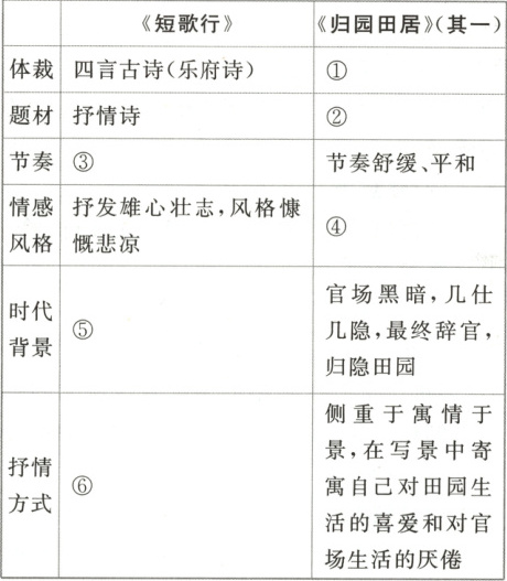 1. 《短歌行》和《归园田居》(其一)虽然都是早期的古体诗,但它们的背景、题材、情趣、抒情方式等各异。试根据提示作简要比较,填写下表。(见教材P59“学习提示”第1段)