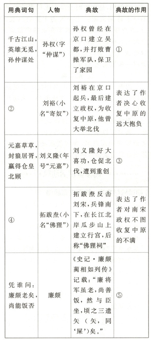 1. 《永遇乐·京口北固亭怀古》为词人登高凭眺、怀古伤今之作,豪迈悲壮。这首词使用了哪些典故?用典的意图各是什么?请结合课文注释填写下面表格。(见教材 P68“学习提示”第 3 段)