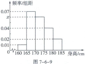 180),[180,185]分组,得到样本身高的频率分布直方图如图7−6−9所示.