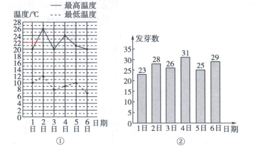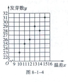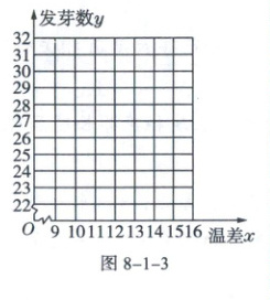(1)请在图 8-1-3 中画出发芽数$y$与温差$x$的散点图;