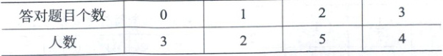 由题意,答对题目个数为0,1,2,3的人数分别为3,2,5,4(分别记为$A$组、$B$组、$C$组、$D$组)。