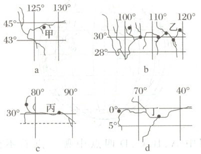15. 如果在图中的 a、b、c、d 四河中顺流放木排,假设水文地质条件相同的情况下,木排向河流右岸偏移最严重的河流是(
