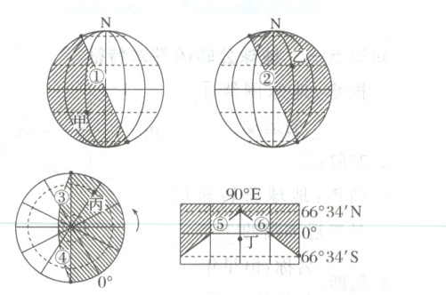下列各图中的阴影部分代表黑夜。据此完成(1)~(3)题。