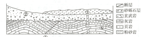 下图示意某地质剖面,其中①指断层。据此完成(1)~(2)题。