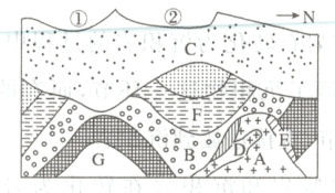 [例1] 下图为某地地质剖面图,其中 C 为沉积物,B、F、G 为沉积岩,A、D 为不同时期的岩浆岩,E 为变质岩。据此完成(1)~(3)题。