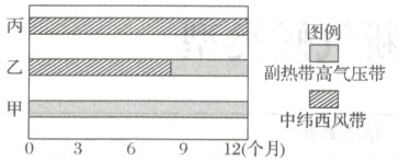 下图为大陆西岸甲、乙、丙三地全年气压带、风带控制时长示意图。读图,完成1~2题。