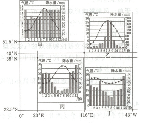 (1)乙图。根据乙图所示地理位置(116°E,40°N)可以确定它反映的是北京市的经纬度坐标;另外,根据乙图的气候和降水特征,可以判断它代表的是温带季风气候,而北京市属于温带季风气候。
