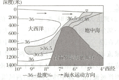 (3)地中海(蒸发旺盛)海水的盐度比大西洋高,密度比大西洋大,水面比大西洋低,因此,大西洋表层海水经直布罗陀海峡流入地中海。