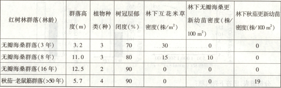 21. (12分)上世纪70~90年代珠海淇澳岛红树林植被退化,形成的裸滩被外来入侵植物互花米草占据,天然红树林秋茄(乔木)-老鼠簕(灌木)群落仅存32hm²。为保护和恢复红树林植被,科技人员在互花米草侵占的滩涂上成功种植红树植物无瓣海桑,现已营造以无瓣海桑为主的人工红树林600hm²。各林龄群落的相关特征见下表。