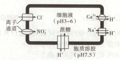 解题思路由图可知,细胞液的pH为3~6,胞质溶胶的pH为7.5,说明细胞液的H⁺浓度高于胞质溶胶的pH,若要长期维持膜内外的H⁺浓度梯度,需通过主动运输将胞质溶胶中的H⁺逆浓度梯度运输到细胞液中,A正确;Cl⁻、NO₃⁻通过离子通道进入液泡属于协助扩散,不需要ATP直接供能,B正确;液泡膜上的载体蛋白能将H⁺转运出液泡的同时将胞质溶胶中的Na⁺、Ca²⁺转运到液泡内,说明Na⁺、Ca²⁺进入液泡的方式为主动运输,消耗的能量来自液泡膜两侧H⁺浓度差产生的电化学势能,C错误;白天光合作用合成的蔗糖可富集在液泡中,避免了胞质溶胶中光合产物的过度积累,有利于光合作用的持续进行,D正确。