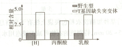 解题思路有氧呼吸的第一阶段在细胞质基质中进行,该阶段会产生[H],[H]可进入线粒体中参与有氧呼吸的第三阶段,所以线粒体中的[H]可来自细胞质基质,A正确;有氧呼吸第二阶段丙酮酸会彻底水解,但由题图可知,T基因缺失突变体线粒体中有氧呼吸中间产物丙酮酸含量高于野生型,说明突变体中有氧呼吸的第二阶段减弱,造成丙酮酸积累较多,B错误;由题干信息可知,T蛋白缺失会造成线粒体内膜受损,而线粒体内膜是进行有氧呼吸第三阶段的场所,故T基因缺失突变体线粒体内膜上的呼吸作用阶段受阻,C正确;由B、C项分析可知,T基因缺失突变体有氧呼吸强度减弱,能量供应减少,而由题图可知,T基因缺失突变体细胞质基质中无氧呼吸产物乳酸含量高于野生型,则突变体有氧呼吸强度的变化可导致无氧呼吸的增强,D正确。