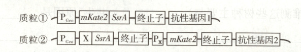 (3)在W2快速生长期,PG启动子驱动X - SsrA基因转录,X - SsrA基因编码的C - 末端带有SsrA短肽的阻遏蛋白X阻遏Px开启转录,mKate2基因无法表达,故细胞快速生长期无荧光;进入生长稳定期后,P₆₀₀启动子停止驱动X - SsrA基因转录,且C - 末端带有SsrA短肽的阻遏蛋白X被大肠杆菌内源蛋白酶系统特异性识别并以一定速率降解,逐渐解除对Px的抑制作用,Px开启mKate2基因的转录,合成mKate2,培养基出现荧光,且随培养时间增加,荧光强度逐渐增强。