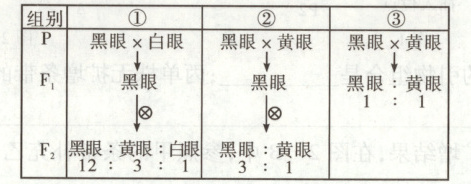 (1)组别①的F₁均为黑眼,而且F₂表型数量比为12:3:1,是9:3:3:1的变式,由此可知F₁基因型为AaBb,其可产生四种配子,分别为AB、Ab、aB和ab。由题意“黄眼基因B对白眼基因b为显性,基因A存在时,眼色表现为黑色,基因a不影响B和b的作用”可知,黑眼个体的基因型为A___,黄眼个体的基因型为aaB_,白眼个体的基因型为aabb。故F₂中黑眼个体的基因型有AaBb、AABB、AaBB、AABB、AAbb、Aabb,共6种。