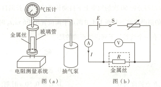 (2) 打开抽气泵,降低玻璃管内气压 $p$,保持电流 $I$ 不变,读出电压表示数 $U$,计算出对应的金属丝阻值;