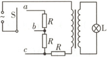 6. 如图,某小组设计了灯泡亮度可调的电路,$a$、$b$、$c$为固定的三个触点,理想变压器原、副线圈匝数比为$k$,灯泡$L$和三个电阻的阻值均恒为$R$,交变电源输出电压的有效值恒为$U$。开关$S$与不同触点相连,下列说法正确的是