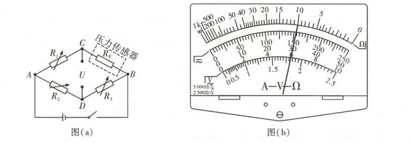 (2)当电压传感器的示数为0时,可知C、D两点的电势相等,则有$I_1R_1=I_2R_2$、$I_1R_{ F}=I_2R_3$,联立解得$R_{ F}=\frac{R_1R_3}{R_2}$。