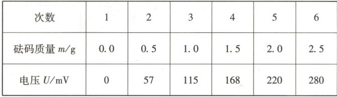 (3) 依次将$0.5 g$的标准砝码加载到压力传感器上(压力传感器上所受压力大小等于砝码重力大小),读出电压传感器示数$U$,所测数据如下表所示:
