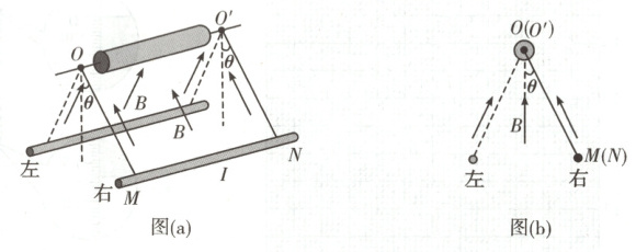 3. 如图(a),直导线 $MN$ 被两等长且平行的绝缘轻绳悬挂于水平轴 $OO'$ 上,其所在区域存在方向垂直指向 $OO'$ 的磁场,与 $OO'$ 距离相等位置的磁感应强度大小相等且不随时间变化,其截面图如图(b)所示。导线通以电流$I$,静止后,悬线偏离竖直方向的夹角为 $\theta$。下列说法正确的是 (
